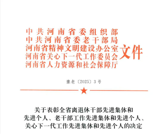 近日,中共河南省委组织部、河南省精神文明建设办公室、中共河南省委老干部局、河南省关心下一代工作委员会、河南省人力资源和社会保障厅联合印发《关于表彰全省离退休干部先进集体和先进个人、老干部工作先进集体和先进个人、关心下一代工作先进集体和先进个人的决定》,重点表彰了在青少年思想道德建设与关爱保护工作中表现突出的集体和个人,全省共98个集体、319名个人获表彰。